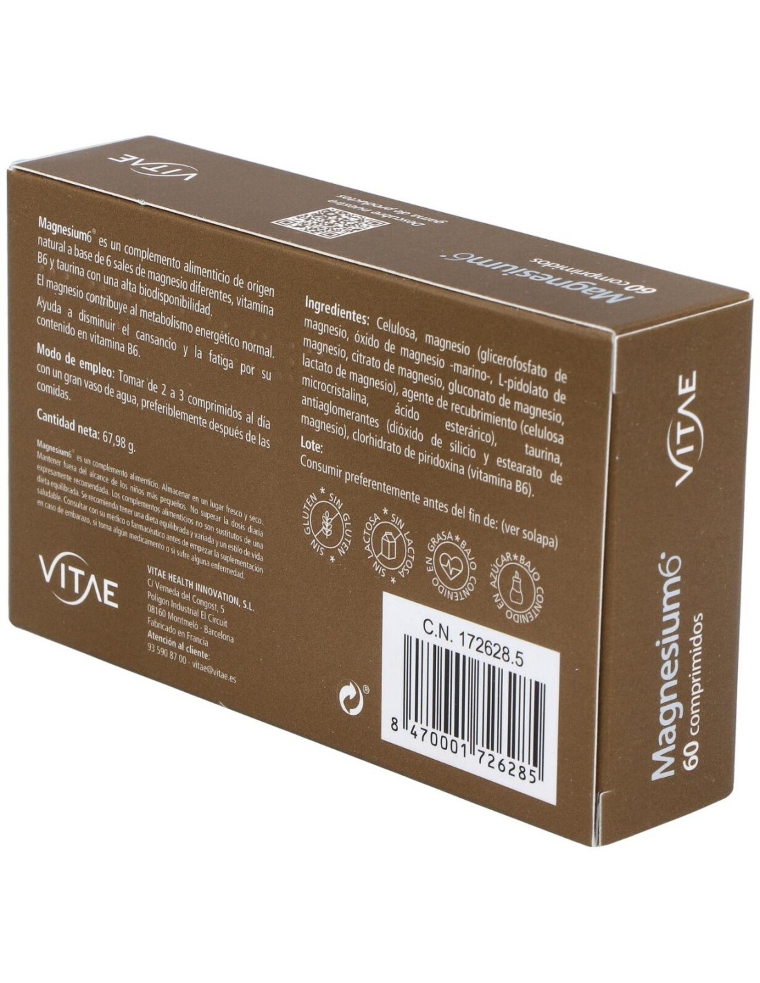Vitae Magnesium6 60comp es un complemento alimenticio elaborado a base de 6 sales de magnesio combinadas con vitamina B6 y taurina.