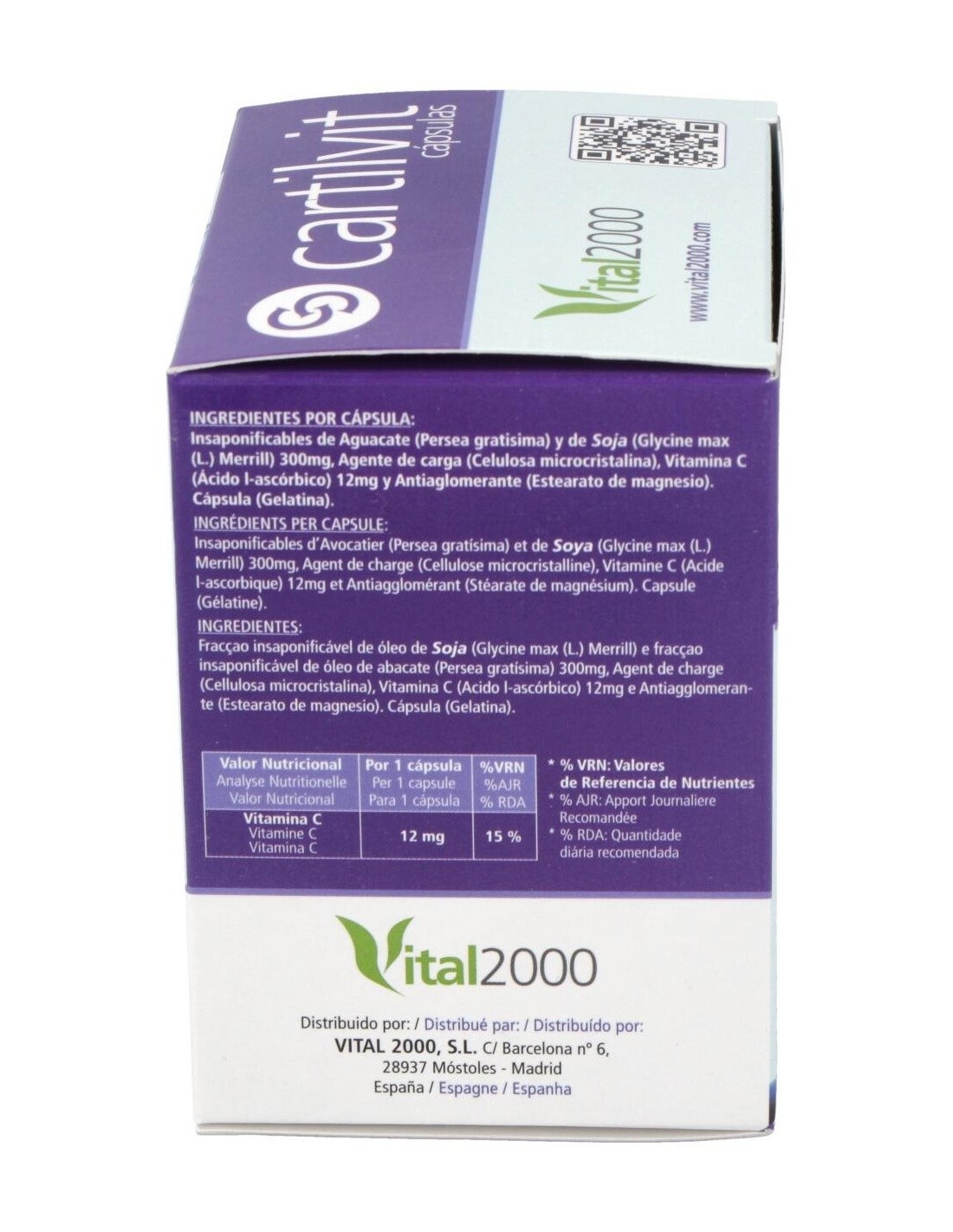 VITAL 2000La vitamina C contribuye a la formación normal de colágeno para el funcionamiento normal de los cartílagos. La vitamina C contribuye a la formación normal de colágeno para el funcionamiento normal de los cartílagos.