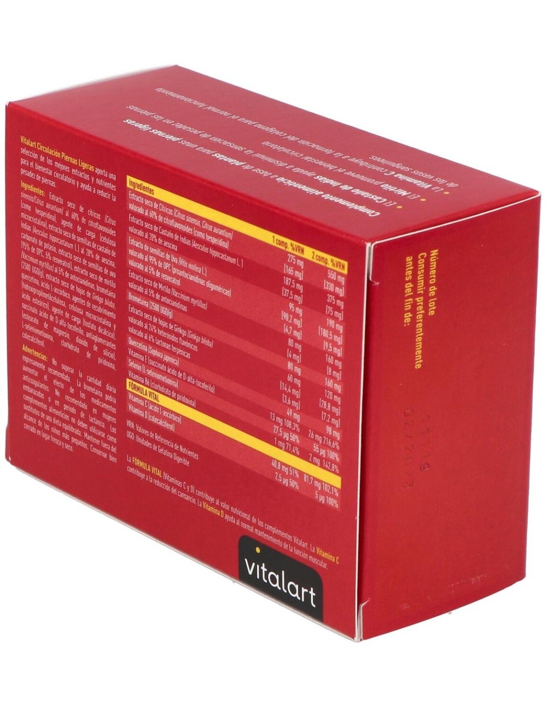 Complemento alimenticio que ayuda a disminuir la pesadez en las piernas. Aporta una selección de los mejores extractos y nutrientes para el bienestar circulatorio. No superar la cantidad diaria expresamente recomendada. La bromelaína podría aumentar el efecto de los medicamentos anticoagulantes. No recomendado en mujeres embarazadas o en período de lactancia. No contiene alérgenos declarables. Sin gluten.