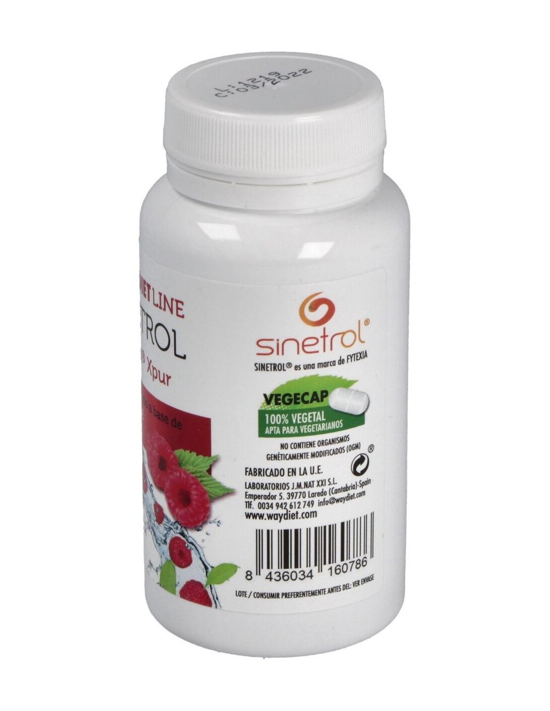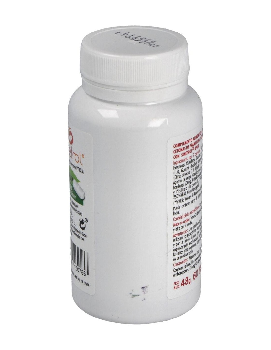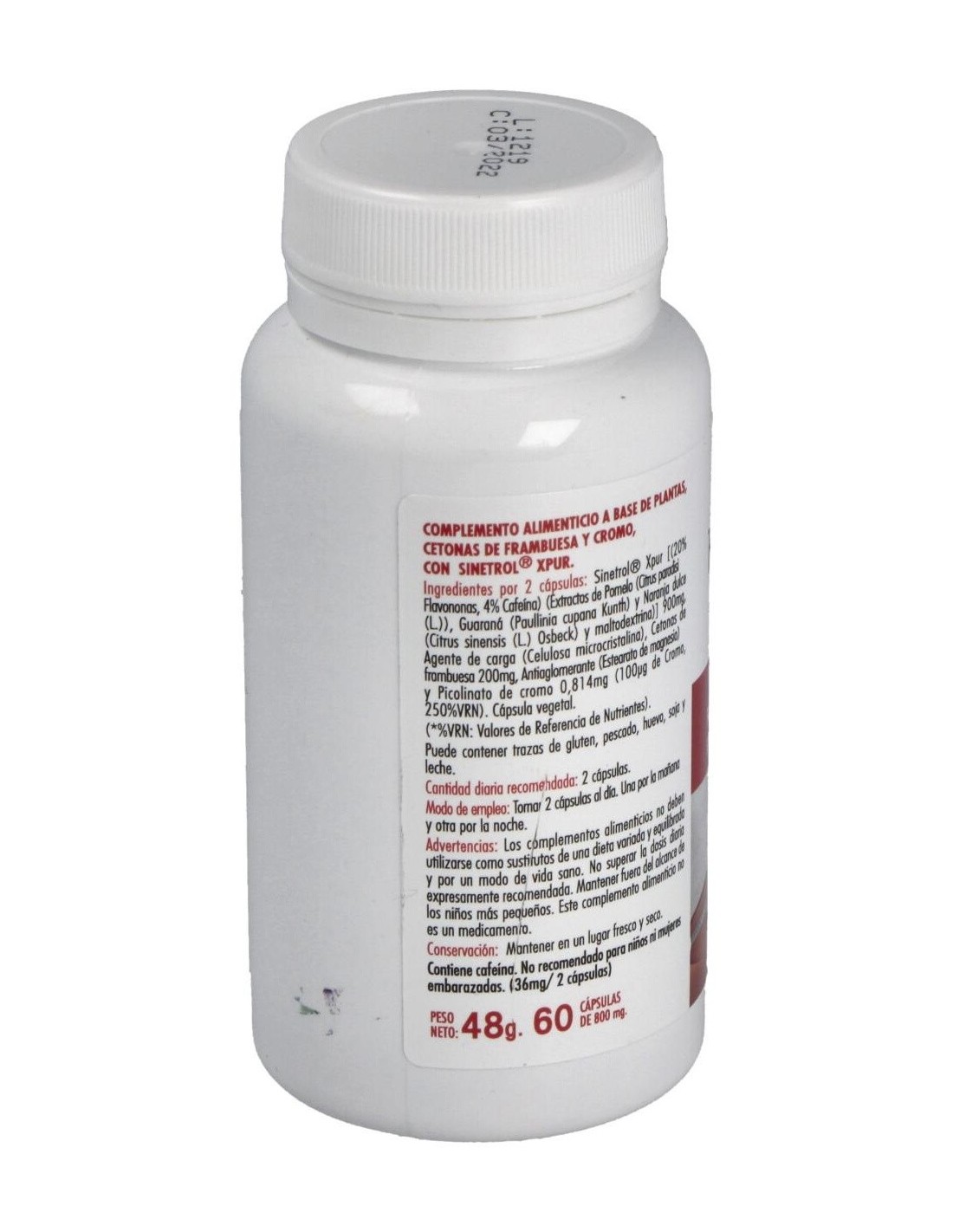 Sinetrol XPUR (Extractos de Naranja dulce (Citrus sinensisL.), Naranja sanguina (Citrus sinensis (L.) Osbeck), Pomelo (Citrus x paradisiMacfad. / Citrus grandis L. Osbeck), Guaraná (Paullinia cupana Kunth., Bonpl. et Kunth) y maltodextrina) 900 mg, Agente de carga (Celulosa microcristalina), Cetonas de frambuesa 200 mg, Antiaglomerante (Estearato de magnesio) y Picolinato de cromo 0,814 mg (100 µg de Cromo).Cápsula vegetal.