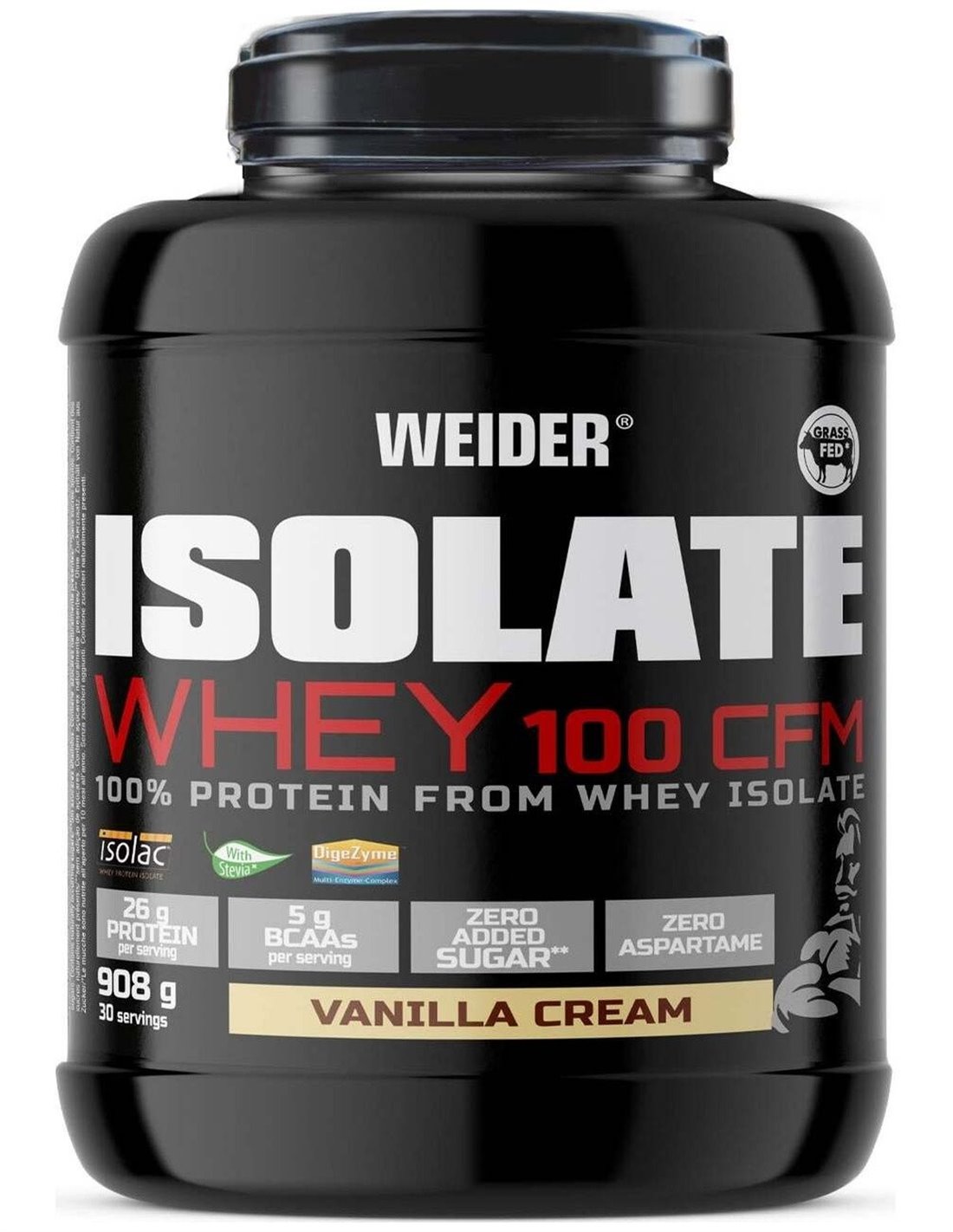 Isolate Whey 100 CFM es una proteína de suero de leche 100% aislada, de máxima pureza y calidad Premium (Isolac®). Está enriquecida con enzimas digestivas (Digezyme®) y no contiene azúcar, ni prácticamente grasa. Su combinación de ingredientes es perfecta para recuperar después de cada entrenamiento. Para esta proteína, Weider utiliza técnicas avanzadas de extracción mecánica en frío (CFM), que consigue un porcentaje de proteína cercano al 90% y mantiene intactas sus propiedades. Como resultado obtenemos un aislado de rápida absorción, con un aminograma excelente y naturalmente muy rico en BCAA’s, aminoácidos fundamentales para la función muscular.
