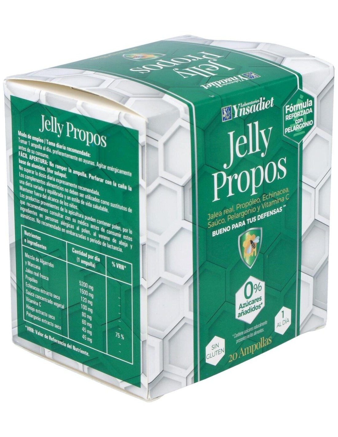 Ynsadiet Jelly Propos es un complemento alimenticio a base de jalea real y própoleo que aporta vitalidad y energía. Además, ayuda a reforzar el sistema inmunitario gracias a su aporte de vitamina C. Está especialmente indicado para personas con sensibilidad a los cambios climáticos.