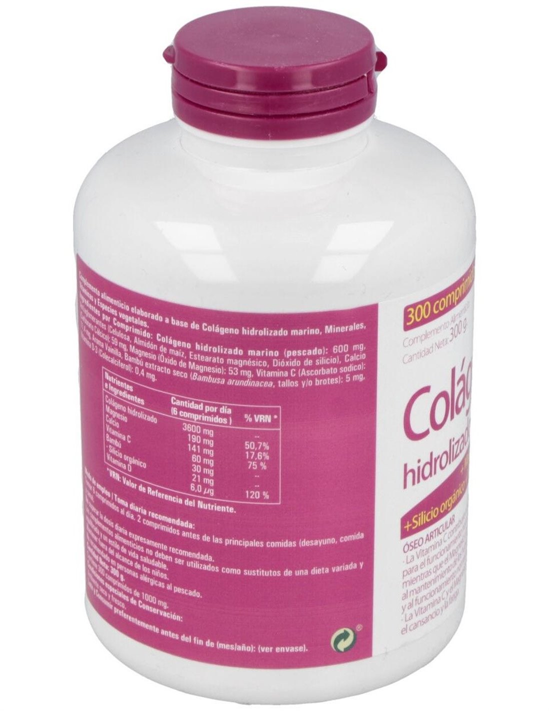 Complemento alimenticio que ayuda a combatir la formación el colágeno el organismo. El magnesio ayuda a aumentar la producción natural de colágeno en el organismo, interviniendo en el momento de mantener el correcto funcionamiento de los órganos y ayudando a activar nuestro sistema muscular a través de la producción de energía. Compuesto a base de colágeno hidrolizado marino, minerales, vitaminas y especies vegetales. Formato de 300 cápsulas.
