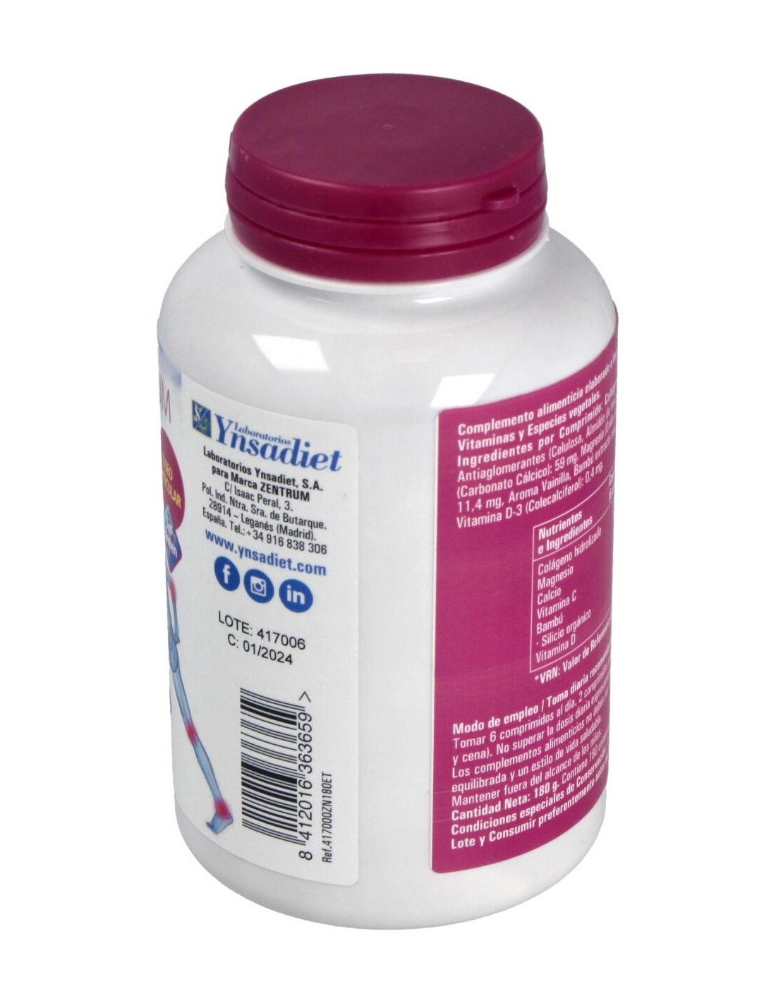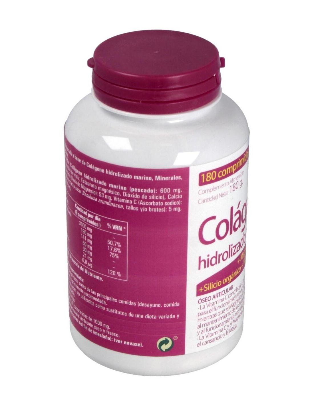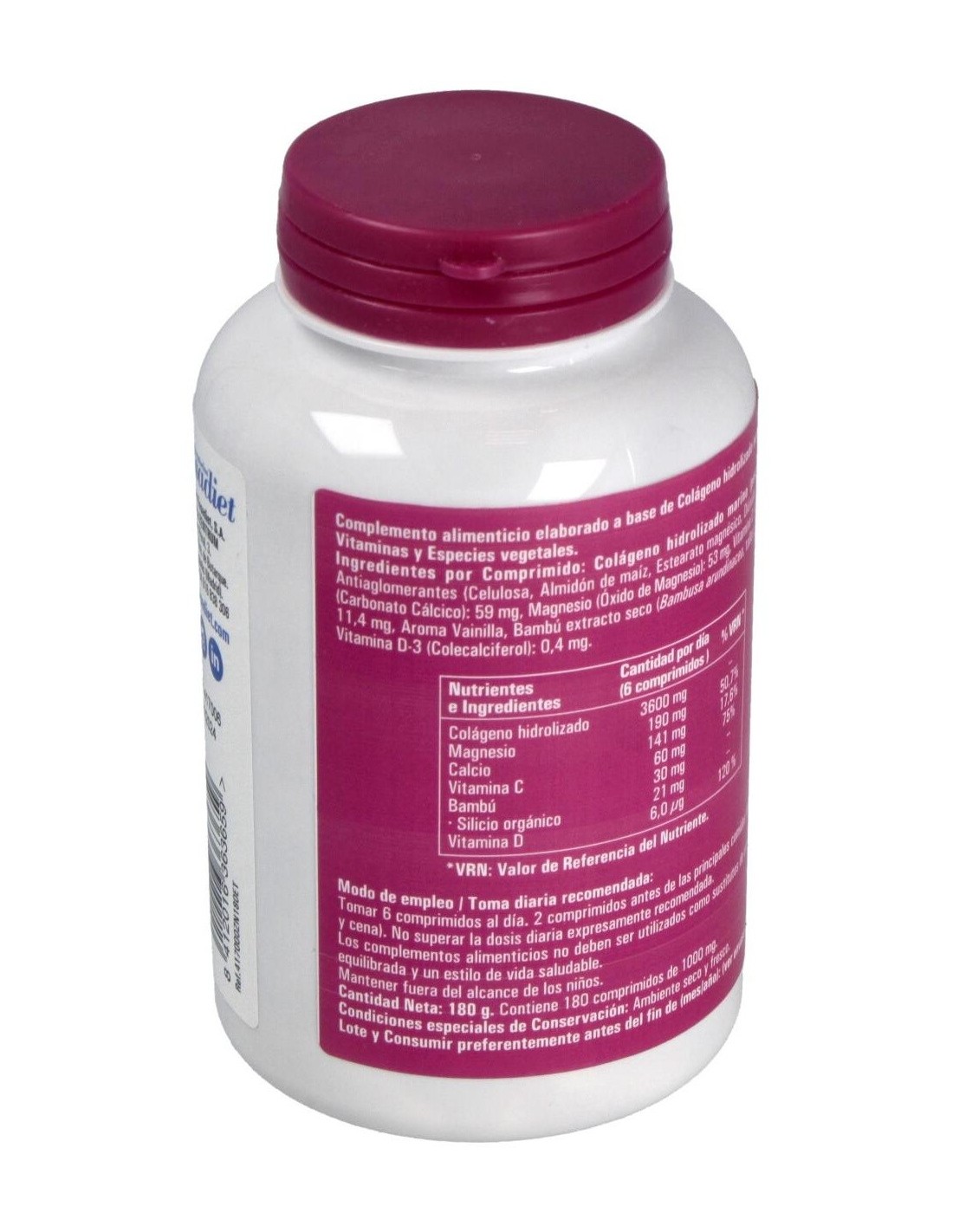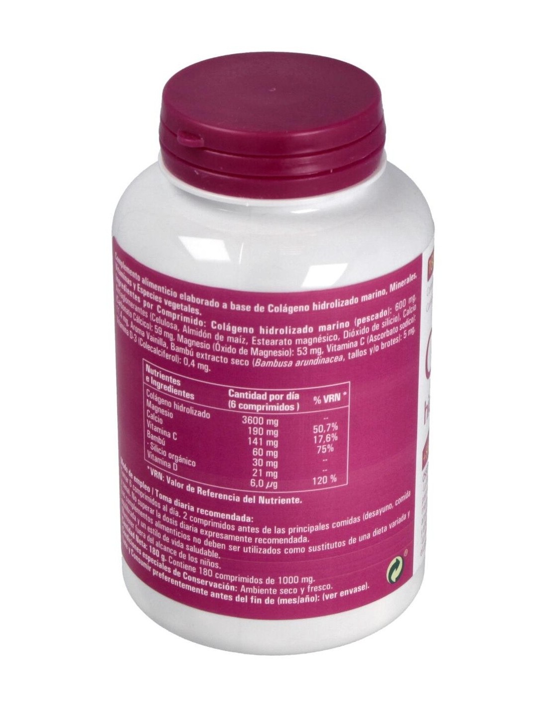 Por comprimido: Colágeno hidrolizado marino (pescado): 600 mg, Calcio (Carbonato Cálcico): 59 mg, Magnesio (Óxido de Magnesio): 53 mg, Vitamina C (Ácido L-Ascórbico): 10 mg, Aroma Vainilla, Bambú extracto seco (Bambusa arundinacea, tallos y/o brotes): 5 mg, Vitamina D-3 (Colecalciferol): 0,4 mg.